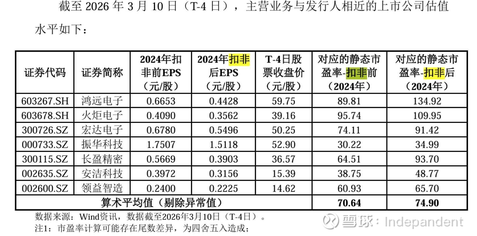 根据公司发布的招股说明书,同类公司估值水平算数平均值上扣费前静态市盈率70.64倍,扣非后74.90倍。