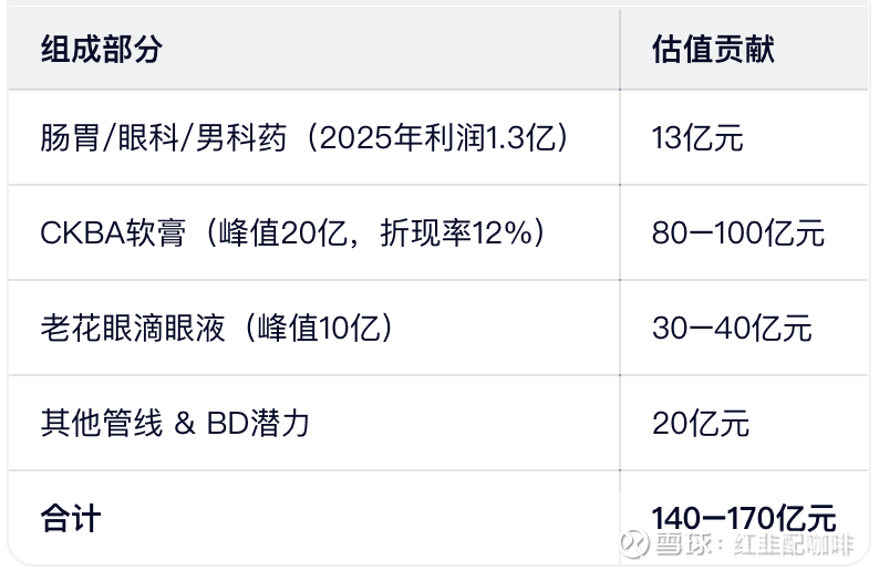 泰恩康的估值 = (传统业务10×PE) + (CKBA软膏30亿DCF) + (老花眼滴眼液10亿DCF) + (BD等情绪溢价25%)