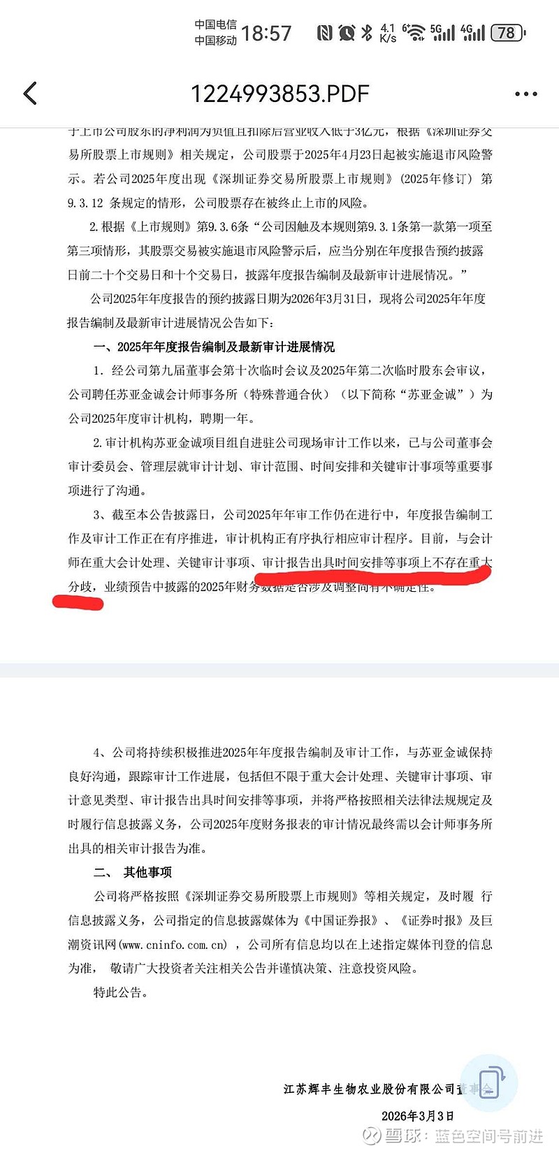 辉丰2025年年度报告编制及审计进展情况的公告出了,摘帽三原则,营收大于三亿,净资产为正,审计报告无重大分歧全齐了。明天开两会了,呆头鹅主力,出来干活