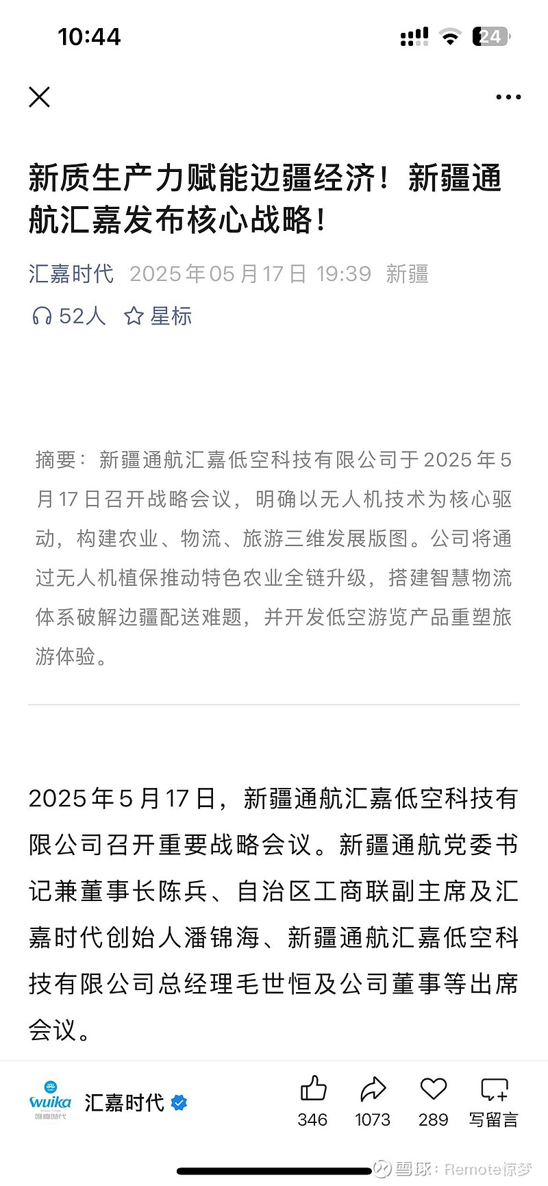 与新疆通用航空合资成立新疆通航汇嘉低空科技有限公司,涵盖物流、旅游、培训考证、农业等领域;