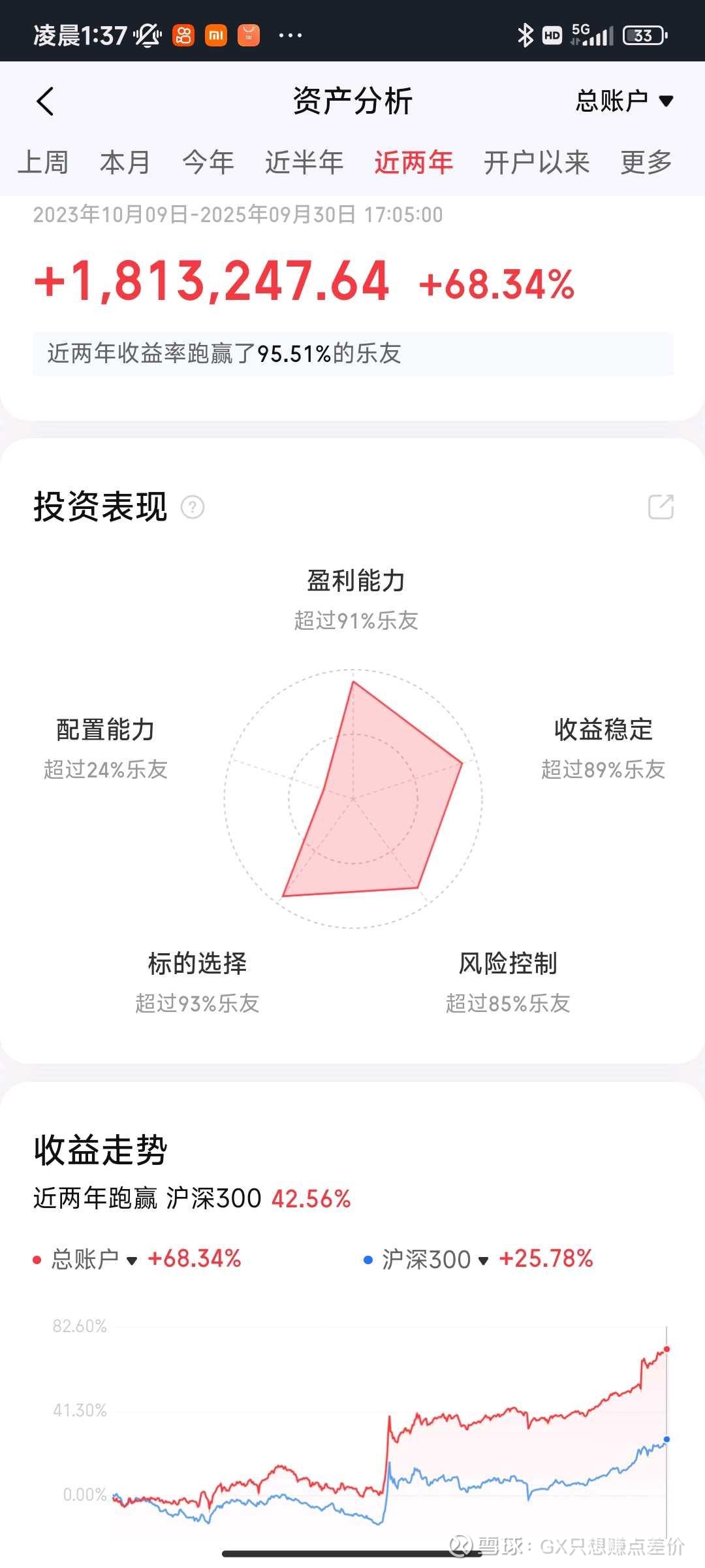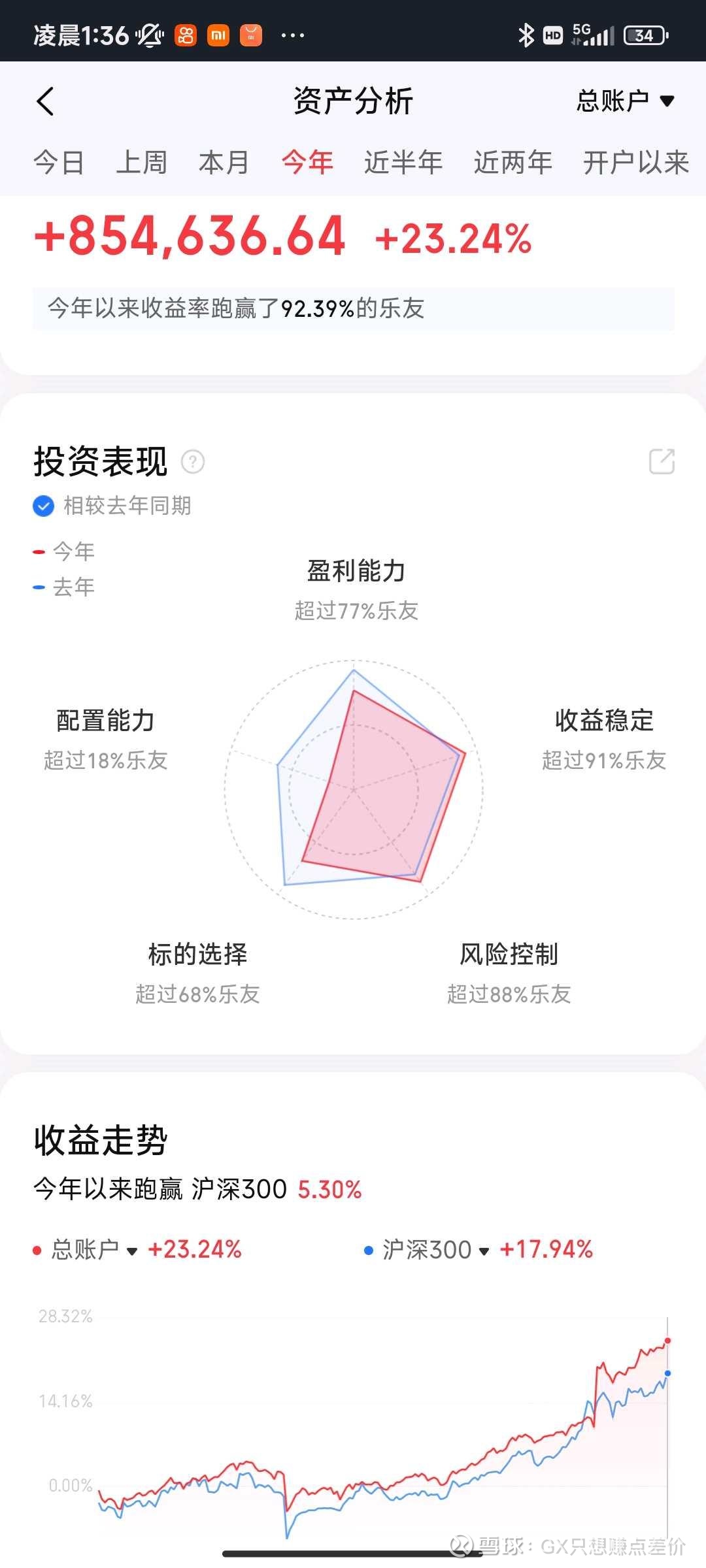 本周只有两天,无操作。得益于$吉林敖东(SZ000623)$ 的上涨,今年收益到23%以上。感觉敖东估值还是有点低,期望盈利也能到50万,加上总仓位只有38%,没舍得卖,卖了也不知道买什么。
