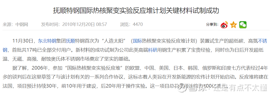 实际上,抚钢早在2010年就已经参与了国际热核聚变实验反应堆计划。