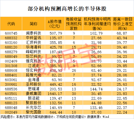 以最新收盘价与机构一致预测目标价相比,18股上涨空间均逾20%。其中,闻泰科技、中科蓝讯、汇顶科技、华海清科、峰岹科技等上涨空间靠前。