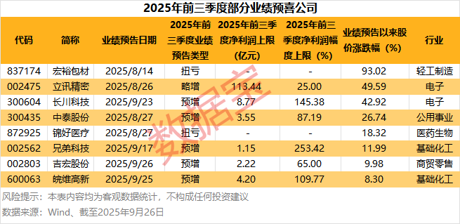 据证券时报·数据宝梳理,截至9月26日收盘,已有30余家公司陆续披露今年前三季度业绩预告,业绩预告来源除业绩预告公告外,部分公司在上市招股说明书或半年报预告等公告中披露相关信息。