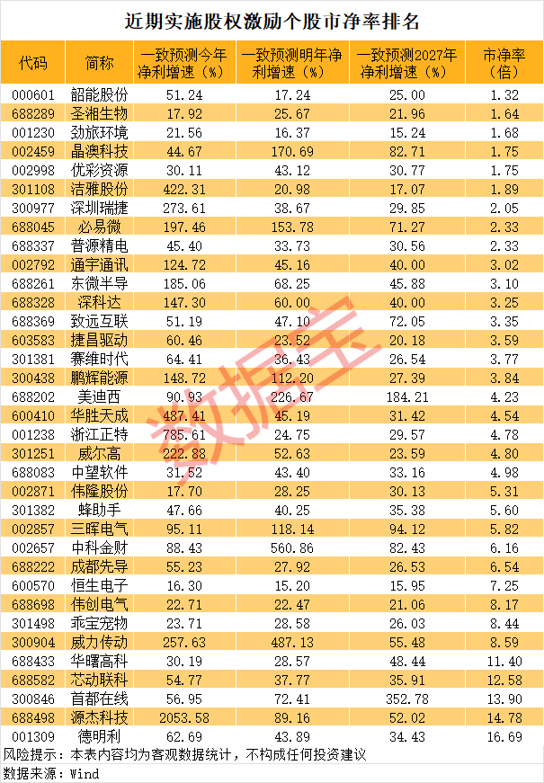部分个股未来业绩有望高成长。数据显示,35只个股机构一致预测今年、明年及2027年净利增速均超15%。其中低估值股票值得重点关注。从市净率角度来看,韶能股份最低估,为1.32倍。