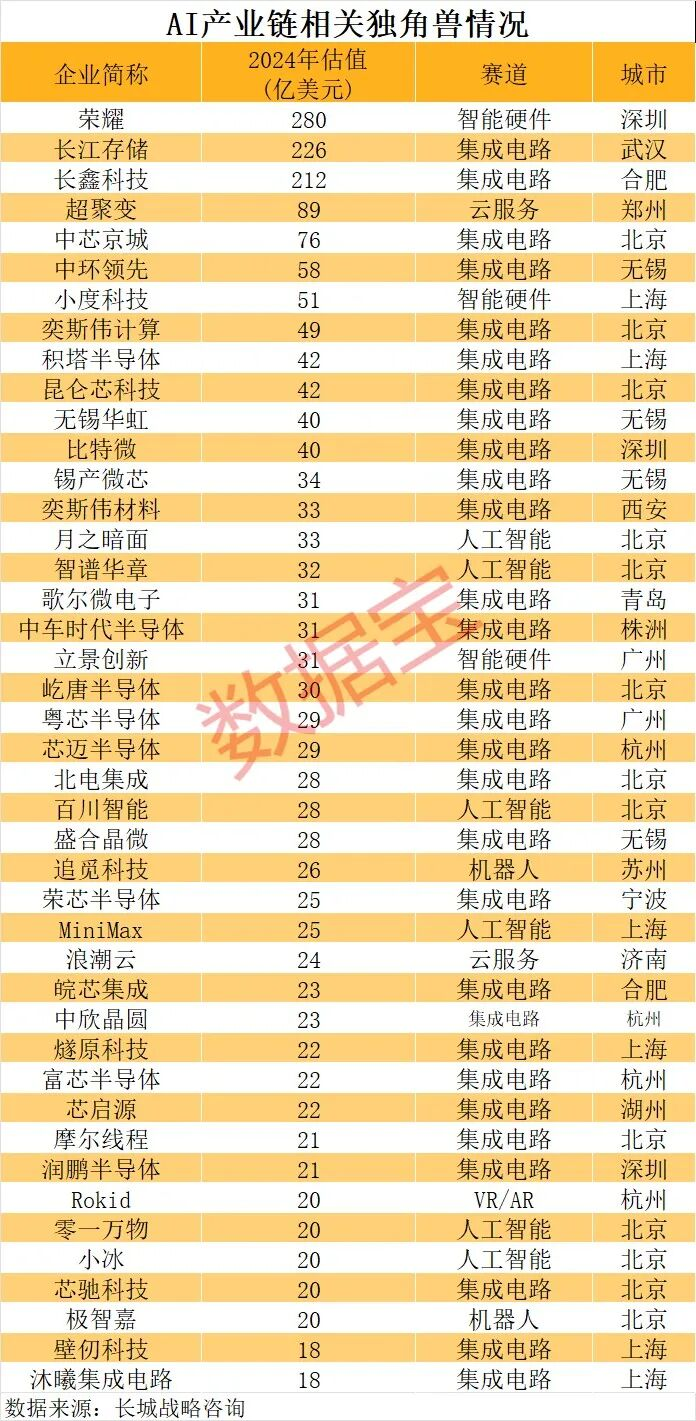 在此大背景下,芯片独角兽未来发展值得期待。近日,长城战略咨询发布《中国独角兽企业研究报告2025》,集成电路独角兽企业包括长江存储、长鑫科技、中芯京城、中环领先、粤芯半导体、盛合晶微、燧原科技、摩尔线程、润鹏半导体、壁仞科技、沐曦集成电路等;另外和AI产业链有关的公司有荣耀、超聚变、月之暗面、智谱华章等。