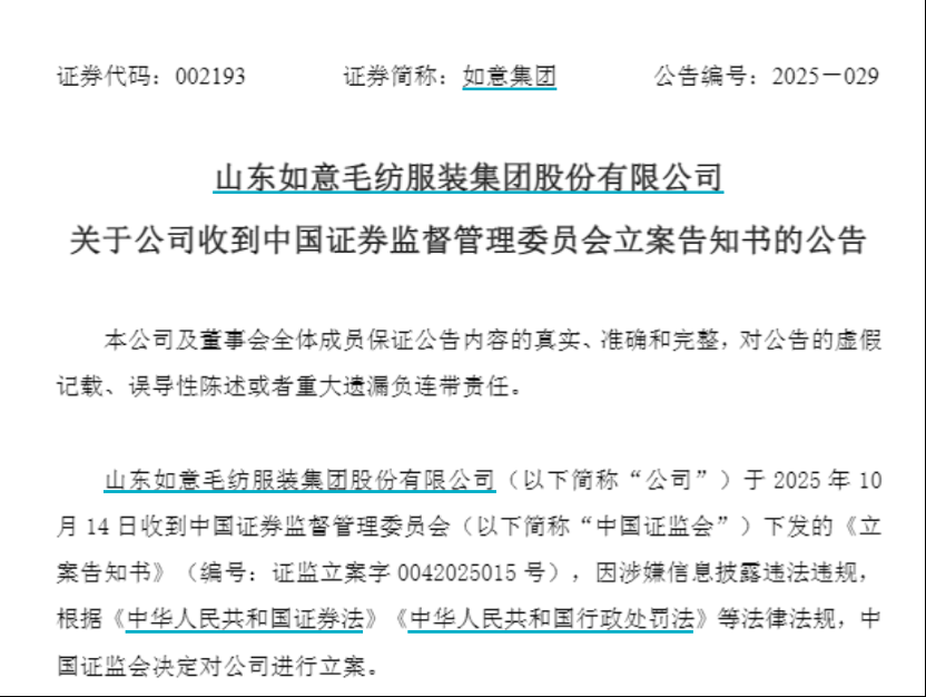 如意集团(002193)10月14日晚间公告称,公司于2025年10月14日收到中国证监会下发的《立案告知书》,因涉嫌信息披露违法违规,中国证监会决定对公司进行立案。公司将积极配合调查工作,并履行信息披露义务。目前公司生产经营正常,本次立案不会对公司产生重大影响。