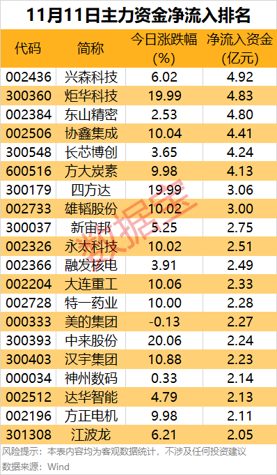 从个股来看,73股主力资金净流入超1亿元,其中8股净流入金额超3亿元。