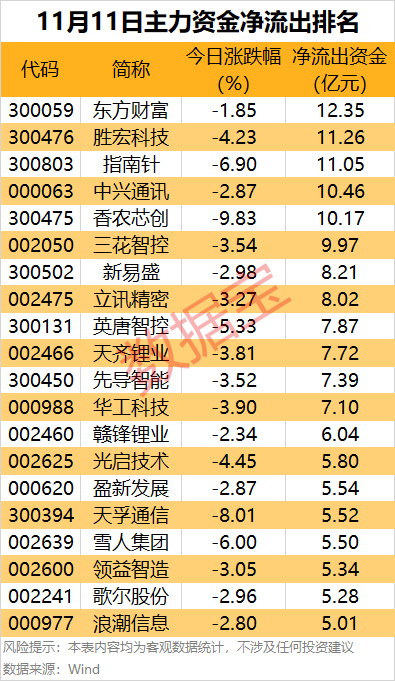 5只热门股遭到主力资金大幅净流出,东方财富主力资金净流出12.35亿元,居首;胜宏科技和指南针主力资金净流出均超11亿元,中兴通讯和香农芯创净流出金额均超10亿元。