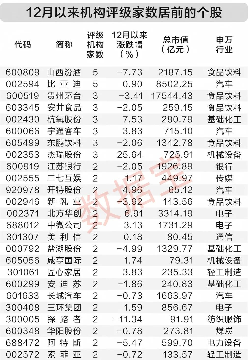 12月以来49家机构合计进行222次“买入型”(包括买入、增持、推荐、强烈推荐、强烈买入)评级,合计覆盖185股。@今日话题