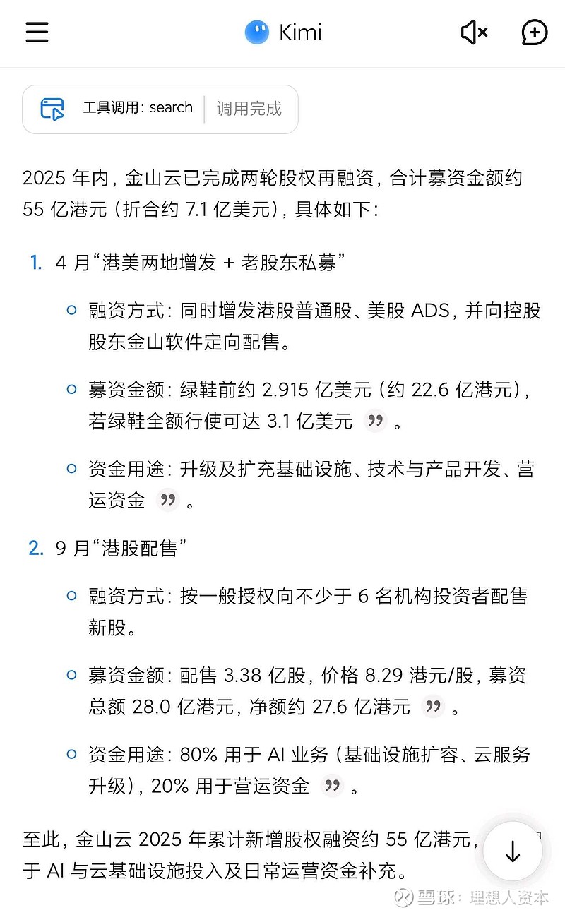 1.2025年4月关税大战开始,雷系公司敏锐的嗅觉感觉可能资本市场上要血雨腥风,未来可能找不到好韭菜,立即融资2.9亿美元,差不多22.65亿港币,这次融资也是所谓厚道的一次,5.83港币一股(目前金山云股价6港币一股),要知道一个月前也就是2月底时,金山云股价达到11.4港币,而4个月之前股价才1块多港币,所以可见雷总炒股厉害,但是这次他也失了手,本来可以10块融资的啊。能让雷系公司这样连滚带爬的半价融资之前未见过,估计之后也不会有,因为特朗普贸易战,遂创造了历史。