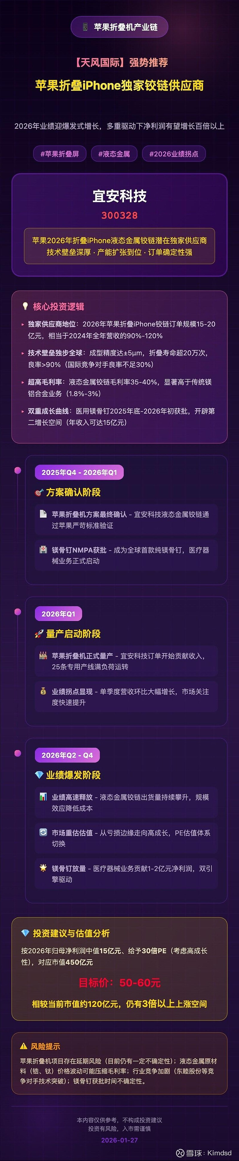 ⚠️风险提示:苹果项目延期风险、原材料价格波动、镁骨钉获批不确定性供。