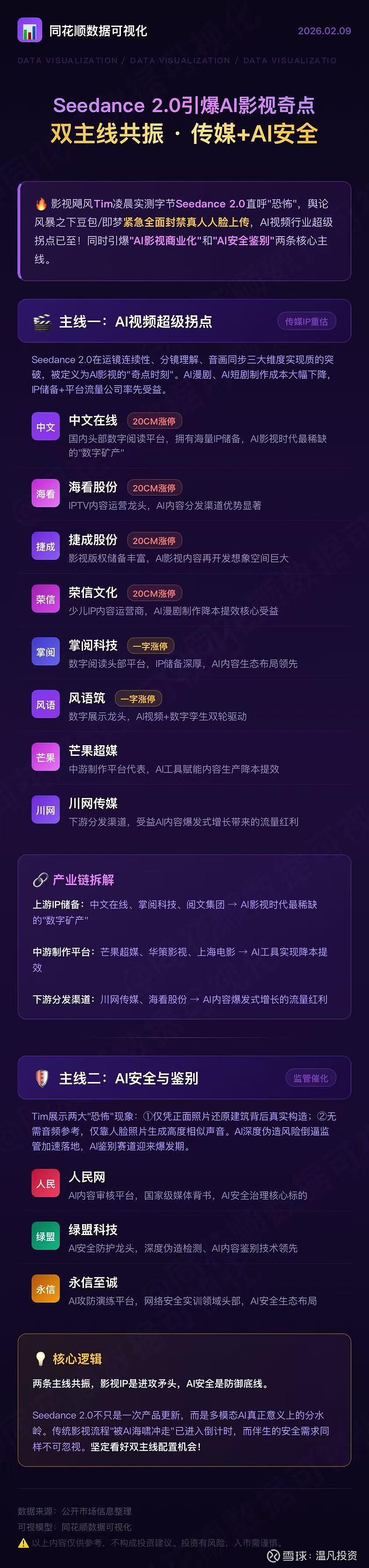 💡总结:两条主线共振,影视IP是进攻矛头,AI安全是防御底线。 Seedance 2.0不只是一次产品更新,而是多模态AI真正意义上的分水岭。传统影视流程”被AI海啸冲走”已进入倒计时,而伴生的安全需求同样不可忽视。坚定看好双主线配置机会!