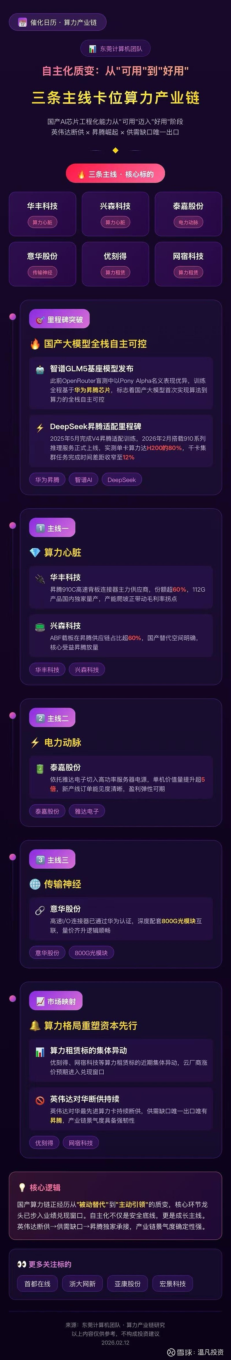$泰嘉股份(SZ002843)$ $兴森科技(SZ002436)$ $意华股份(SZ002897)$ 国产AI算力从“可用”迈向“好用”,智谱GLM-5、DeepSeek V4均基于昇腾落地,实现全栈自主可控,昇腾单卡性能接近H200。英伟达断供下,昇腾产业链高景气。建议沿三条主线布局:算力心脏(华丰、兴森)、电力动脉(泰嘉)、传输神经(意华),同时关注首都在线等算力基建标的。