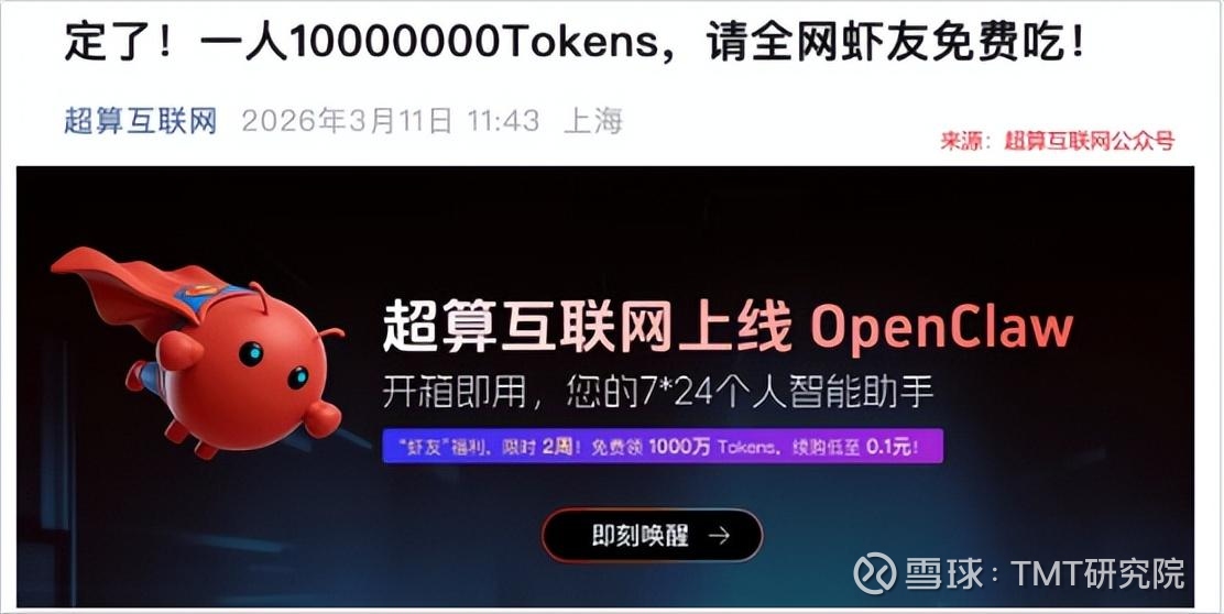 3月11日,国家超算互联网宣布,将面向平台所有OpenClaw用户,每人限时2周免费发放1000万Tokens额度,后续的续购价格更是低至0.1元/百万Tokens。