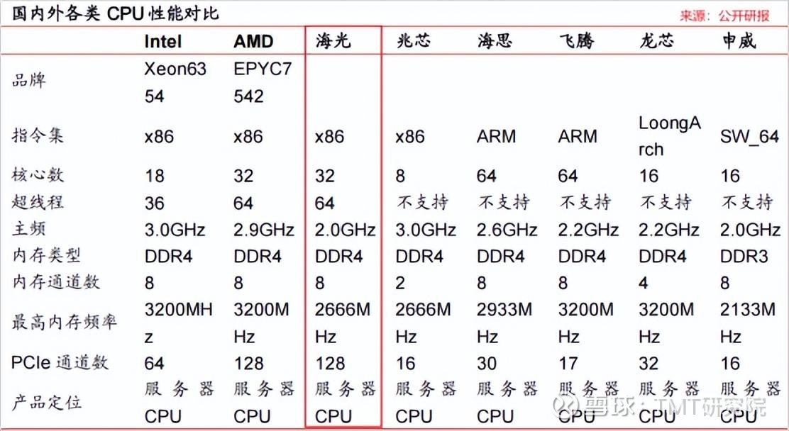 就拿它的7285芯片来举例,这款芯片的核心数,要胜过龙芯中科、申威、兆芯的同期服务器CPU;同时,和鲲鹏、兆芯相比,海光7285在PCle通道数上也较为领先。