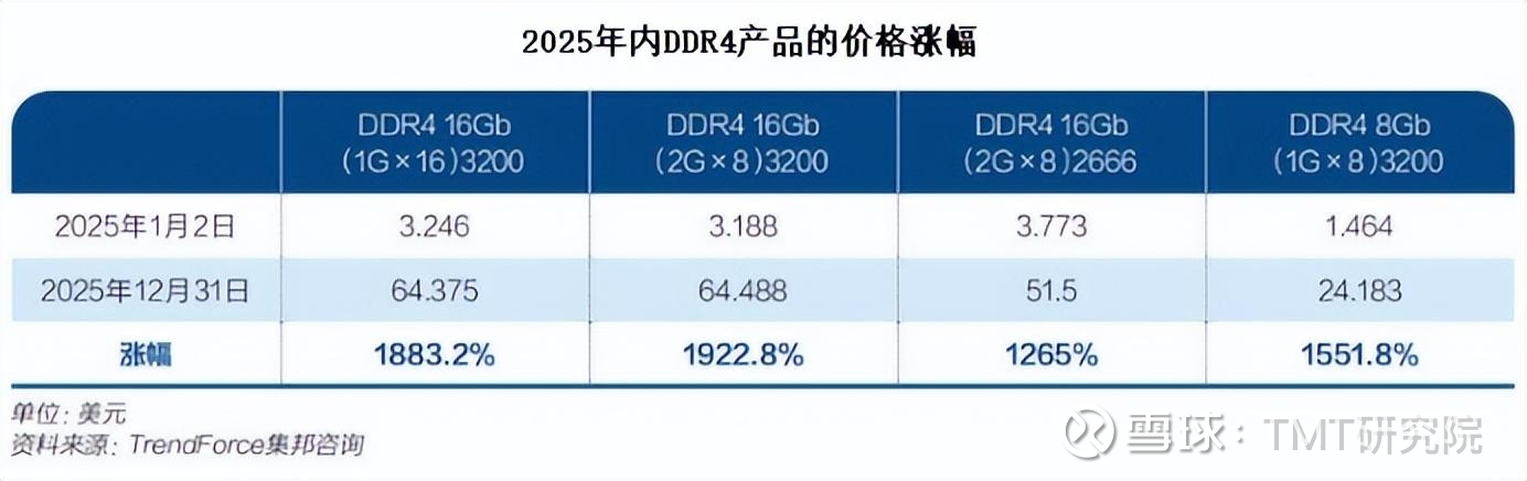 2025年全年,DRAM现货价格指数整体上涨了386%,NAND上涨了207%;甚至部分型号的DDR4 16G内存条价格,年内涨幅狂飙到超过了1900%!