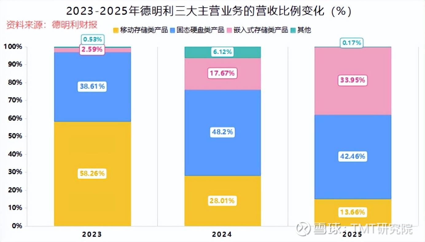 2025年,德明利固态硬盘类产品的营收占比达到42.46%,而就在两年前,还是移动存储类产品坐在第一营收支柱的位置上。