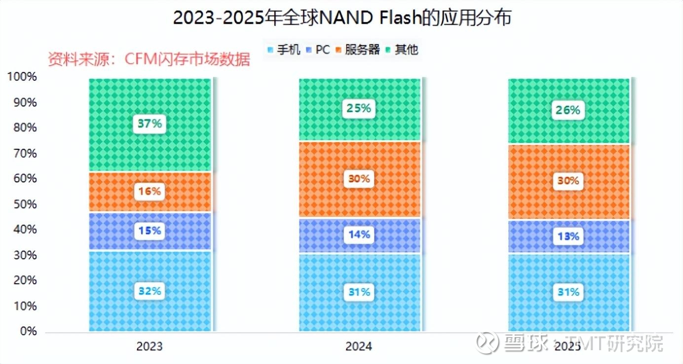 根据CFM闪存市场发布的数据,2024年时,全球存储芯片的下游需求主要来自服务器、手机和电脑市场,这三个领域包揽了全球DRAM与NAND需求的75%-80%。