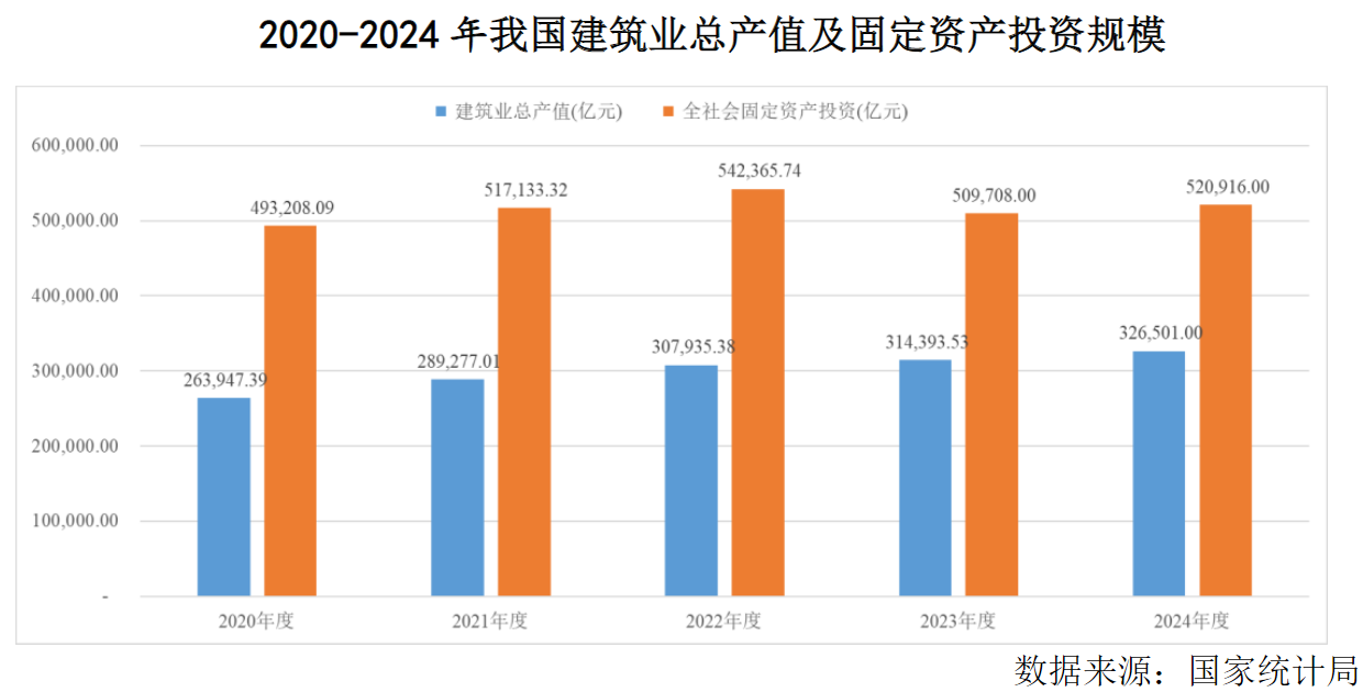 工程咨询行业的市场空间与全社会固定资产投资规模密切相关。根据国家统计局公布数据,2020年至2024年我国全社会固定资产投资完成额从49.32万亿元增至52.09万亿元,建筑业总产值从26.39万亿元增至32.65万亿元。