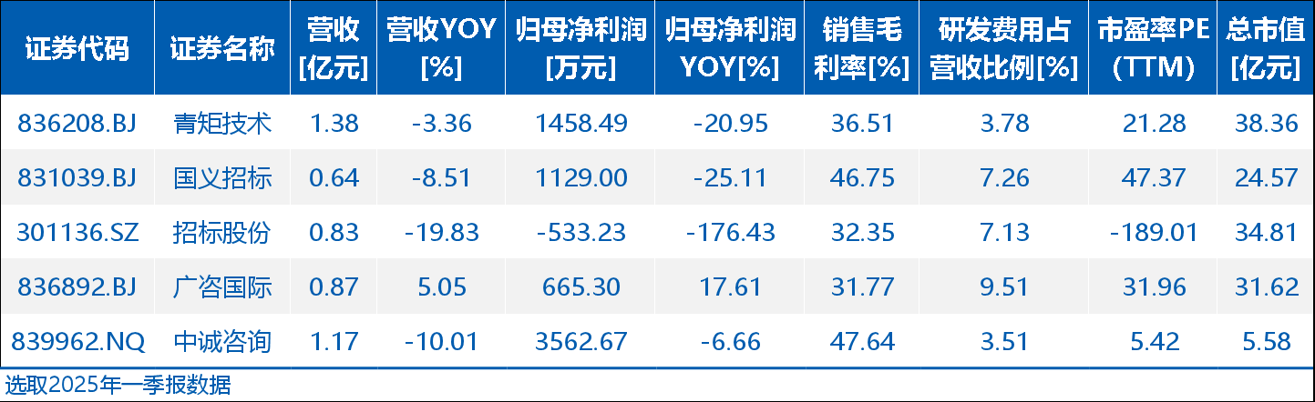同行业上市公司方面,选取青矩技术(836208)、国义招标(831039)、招标股份(301136)和广咨国际(836892)为可比公司。