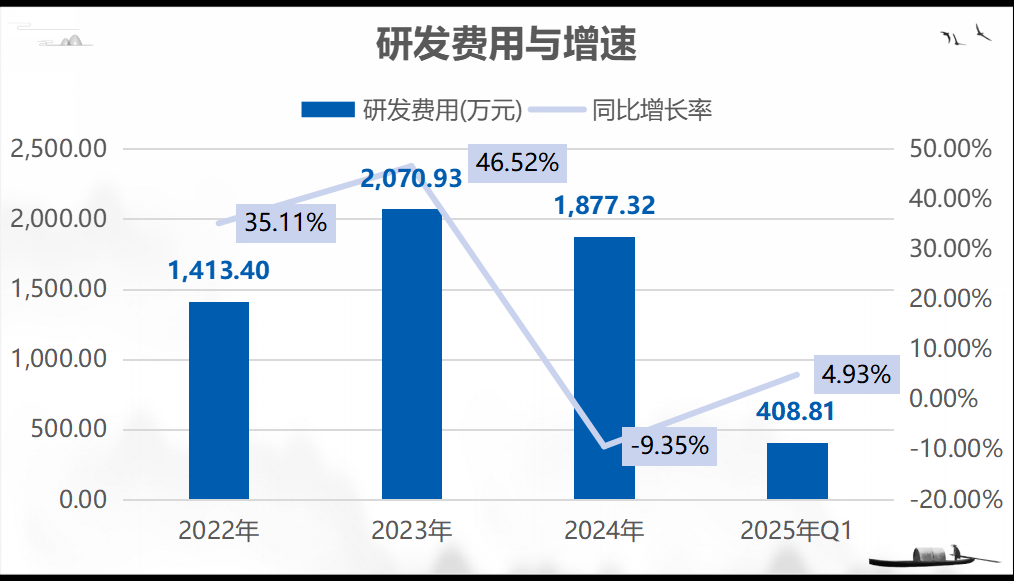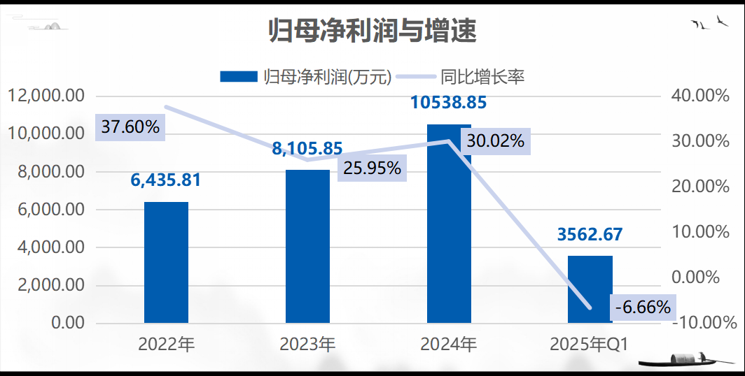 从归母净利润来看,2022-2024年公司归母净利润分别为6435.81万元、8105.85万元和10538.85万元,CAGR为27.97%;2025年Q1,公司归母净利润为3562.67万元,同比减少6.66%。