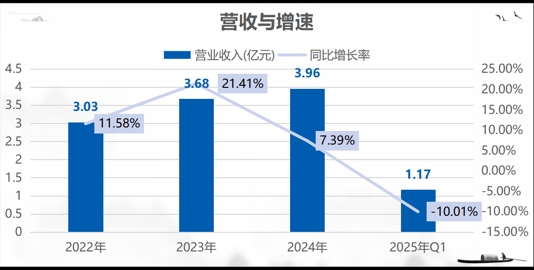 营收方面,2022-2024年公司营收分别为3.03亿元、3.68亿元和3.96亿元,CAGR为%;2025年Q1,公司营收为1.17亿元,与上年同期相比减少10.01%。