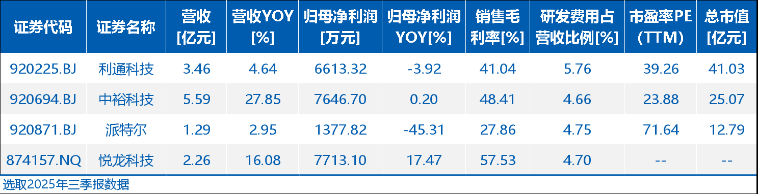 同行业上市公司方面,选取利通科技(920225)、中裕科技(920694)、派特尔(920871)为可比公司。
