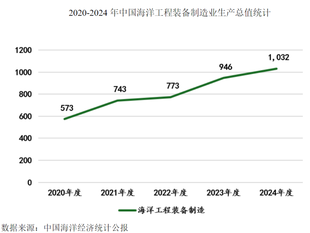 根据中国船舶工业协会统计,2024年,全球共成交海洋工程装备215艘,成交金额272.2亿美元,同比增长85%。随着市场需求的持续回暖,海洋工程装备正呈现良好发展势头。根据中国海洋经济统计公报,2024年中国海工装备制造企业生产总值达1,032亿元,同比增长9.09%。