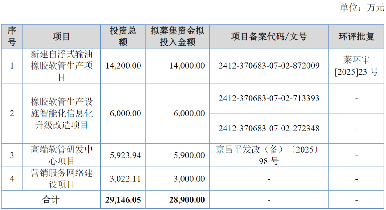 本次IPO拟募集资金2.89亿元用于新建自浮式输油橡胶软管生产项目、橡胶软管生产设施智能化信息化升级改造项目、高端软管研发中心项目和营销服务网络建设项目。其中,新建自浮式输油橡胶软管生产项目建成后,自浮式输油橡胶软管生产线可实现年产6.60万标米。