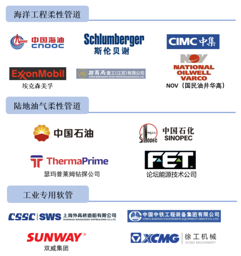 公司产品面向全球销售,客户分布于中国、欧洲、美洲、东南亚、中东、非洲等多个国家和地区,为中海油、中石油、中石化、招商重工、中集集团、上海外高桥、斯伦贝谢、特瑞堡、国民油井高华(NOV)、埃克森美孚、FET等众多大型企业单位提供产品及配套服务,并在我国自主设计建造的海上石油钻井平台“海洋石油981”“海洋石油982”“D90蓝鲸1号”“D90蓝鲸2号”、我国自主设计建造的自升自航式风电安装平台“海峰1001”“海峰1002”、我国自主设计建造的首艘超深水大洋科考钻探船“梦想号”等重大工程项目中提供各类柔性管道产品。截至2025年6月30日,公司已经获得授权专利共计68项,其中发明专利27项。