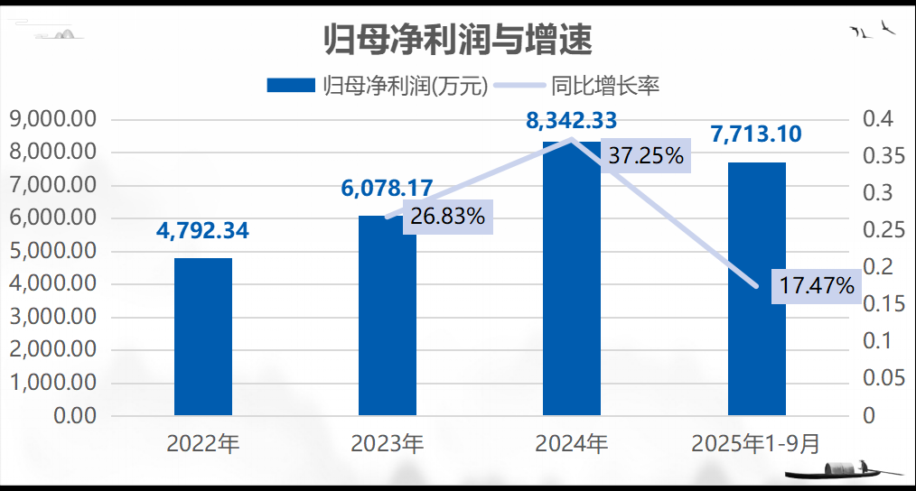 公司归母净利润从2022年的4792.34万元增长至2024年的8342.33万元,CAGR为31.94%;2025年前三季度,公司营收为7713.10万元,与上年同期相比增长17.47%。