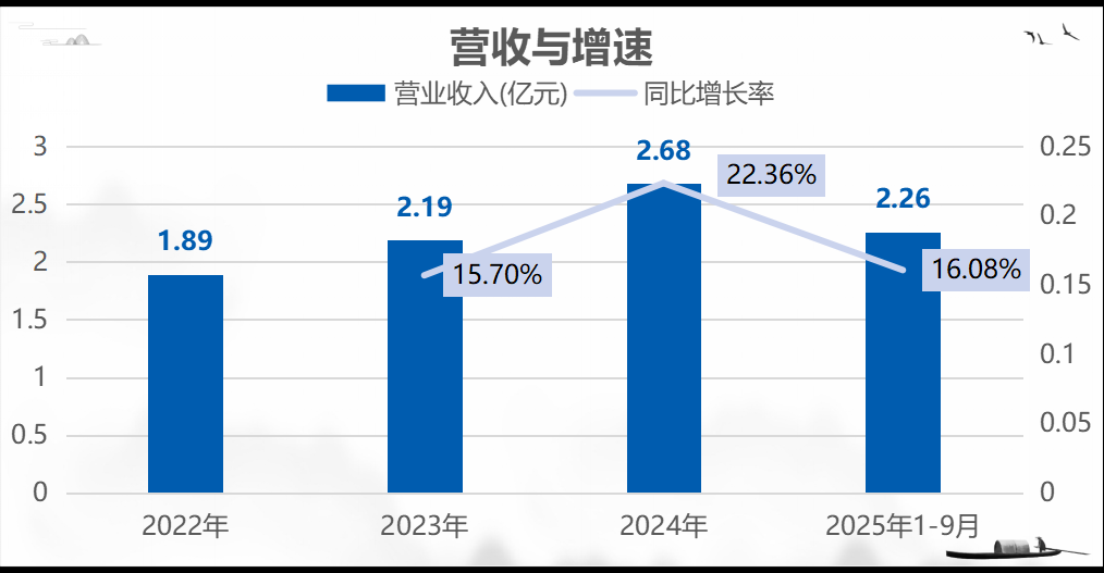 业绩方面,2022-2024年公司营收分别为1.89亿元、2.19亿元和2.68亿元,CAGR为19.08%;2025年前三季度,公司营收为2.26亿元,与上年同期相比增长16.08%