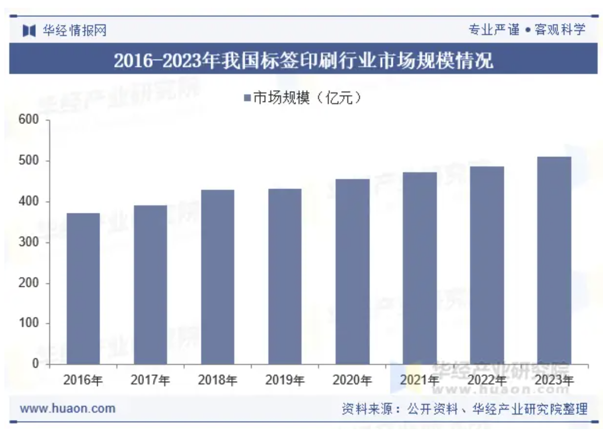 我国标签印刷始于20世纪70年代末期,相比于西方国家起步较晚,但得益于国民经济的持续稳定增长,我国标签市场的增长率一直保持在较高水平,是全球标签增速最快的市场之一。近年来中国标签市场总量进一步增长,占亚洲地区标签市场份额的60%以上。经过40年的发展,我国已经成为世界上最大的标签生产国和消费国,约占全球标签消费总量的四分之一。2023年我国标签印刷行业市场规模约为511.2亿元,同比增长5.1%。