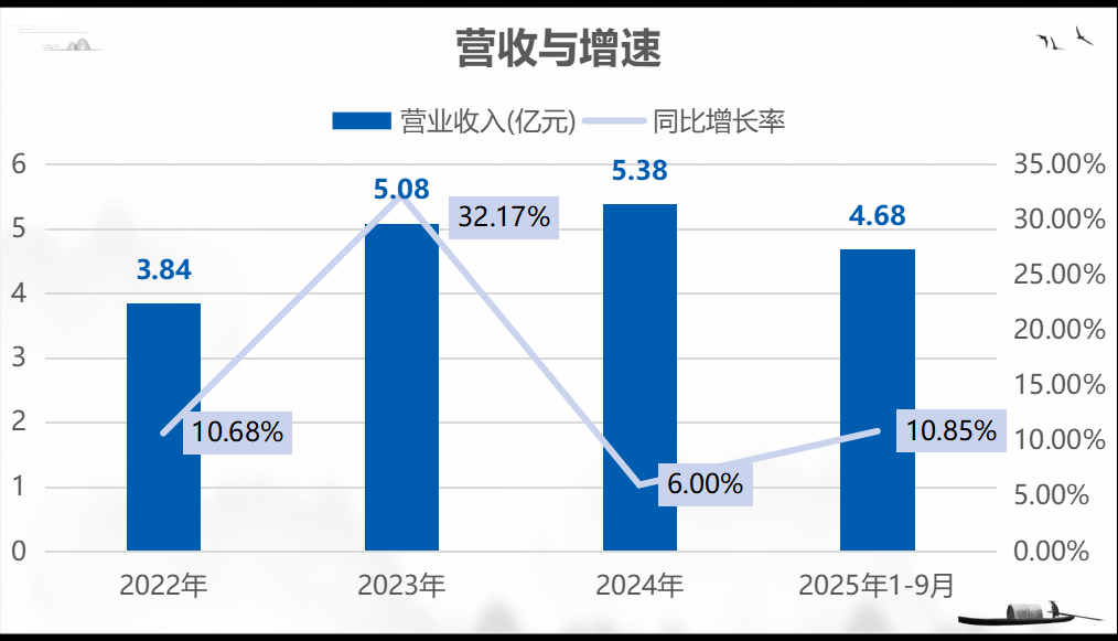 2022-2024年公司营收分别为3.84亿元、5.08亿元和5.38亿元,CAGR为18.37%;2025年1-9月,公司营收为4.68亿元,与上年同期相比增长10.85%。