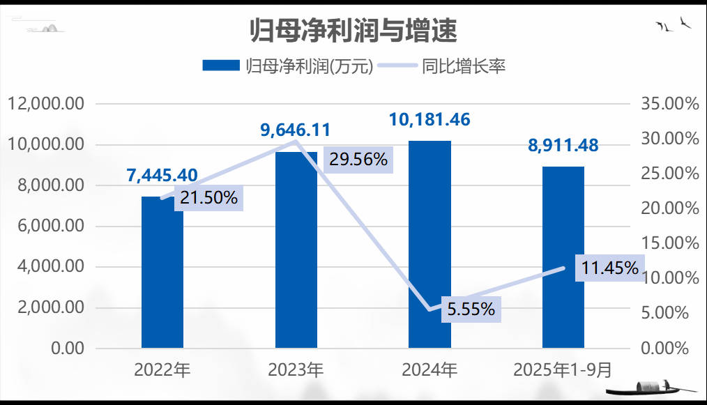 2022-2024年公司归母净利润从7445.40万元增长至10181.46万元,CAGR为16.94%;2025年1-9月,公司归母净利润为8911.48万元,与上年同期相比增长11.45%。