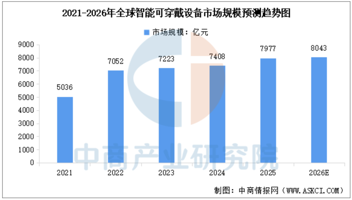 根据中商产业研究院数据,全球智能可穿戴设备市场规模从2021年的5036亿元增长至2024年的7408亿元,期内年均复合增长率达13.7%,2025年全球市场规模约7977亿元。中商产业研究院预测,2026年全球智能可穿戴设备市场规模将达到8043亿元。