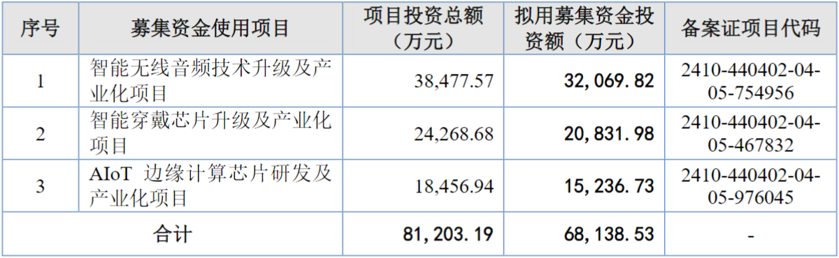 IPO募投方面,本次拟募集资金6.81亿元用于智能无线音频技术升级及产业化项目、智能穿戴芯片升级及产业化项目和AIoT边缘计算芯片研发及产业化项目。