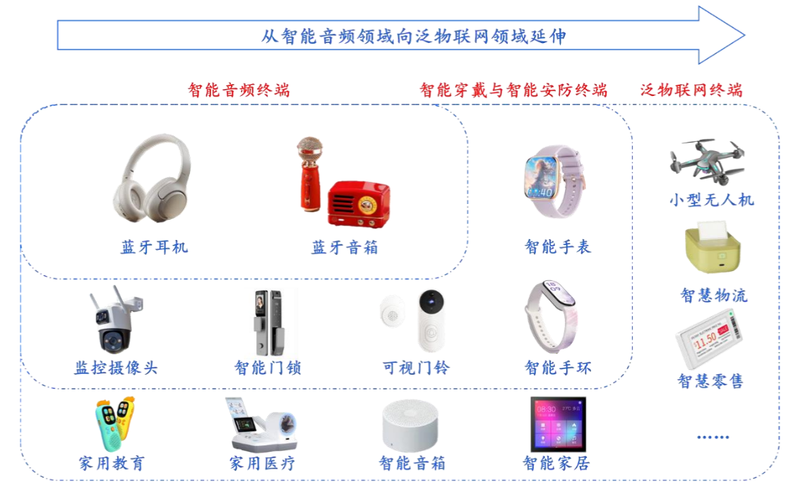 杰理科技研发的SoC芯片主要用作各类智能终端的主控芯片,主要分为蓝牙耳机芯片、蓝牙音箱芯片、智能穿戴芯片、智能物联终端芯片和通用多媒体芯片。随着无线射频技术日新月异,芯片制造工艺不断提升,终端产品形态不断丰富,公司产品的应用领域从智能音频终端、智能穿戴终端、智能安防终端向泛物联网领域开拓延伸。