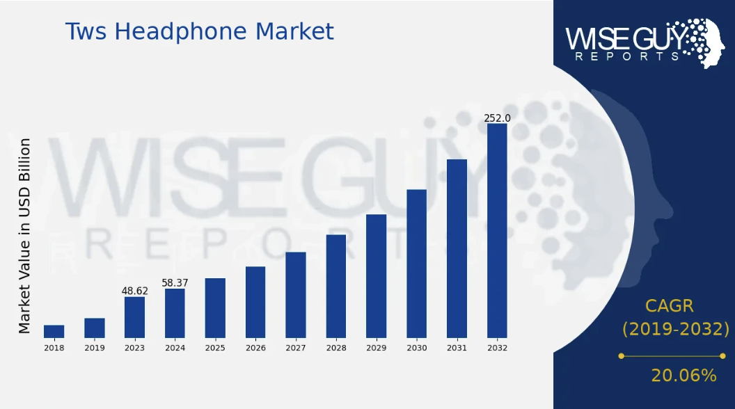 根据wise guy reports数据,2023年TWS耳机市场规模预计为486.2亿美元,而到2024年将增长至583.7亿美元,预计到2032年,这一数字将飙升至2519亿美元,2025-2032年CAGR约为20.06%。