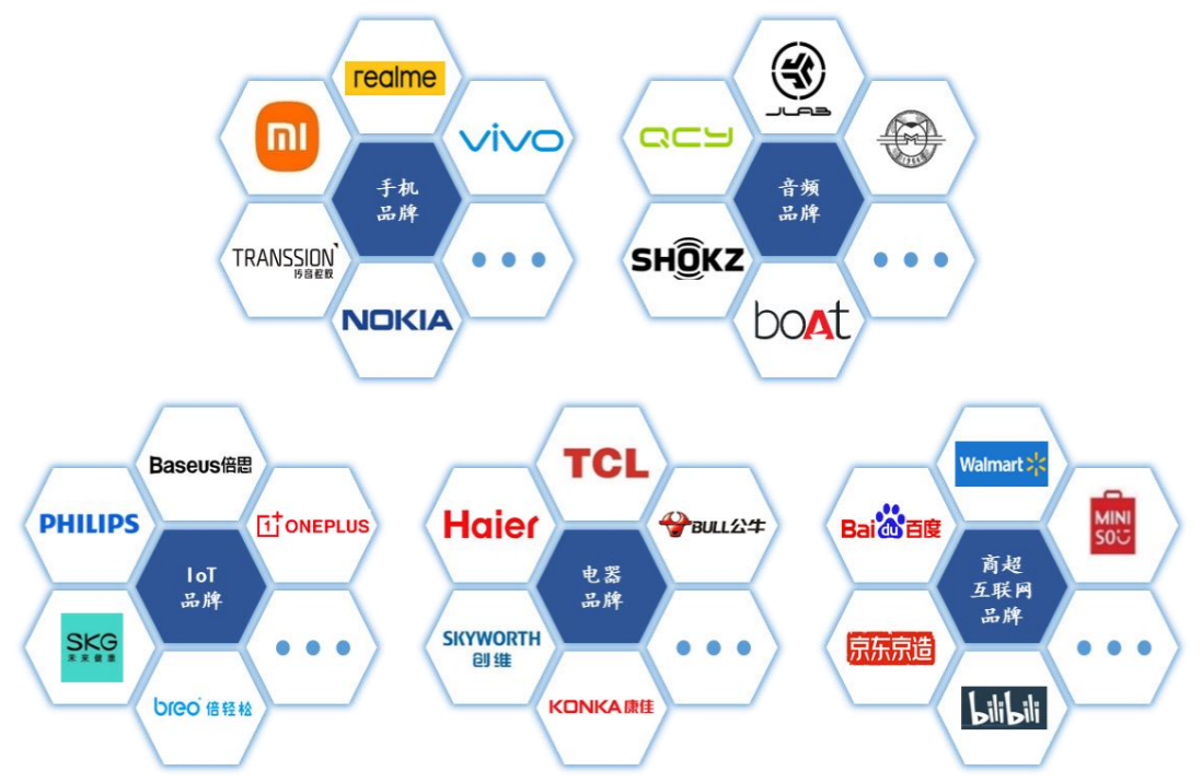 根据公司第一轮问询回复,公司的产品已进入小米、Realme、荣耀、VIVO、NOKIA、摩托罗拉、魅族、传音、QCY、JLAB、猫王、韶音、JBL、boAt、ONEPLUS、倍思、PHILIPS、SKG、海尔、TCL、创维、康佳、京东京造、Walmart等主要品牌客户的供应链,并应用于其推出的新产品中。