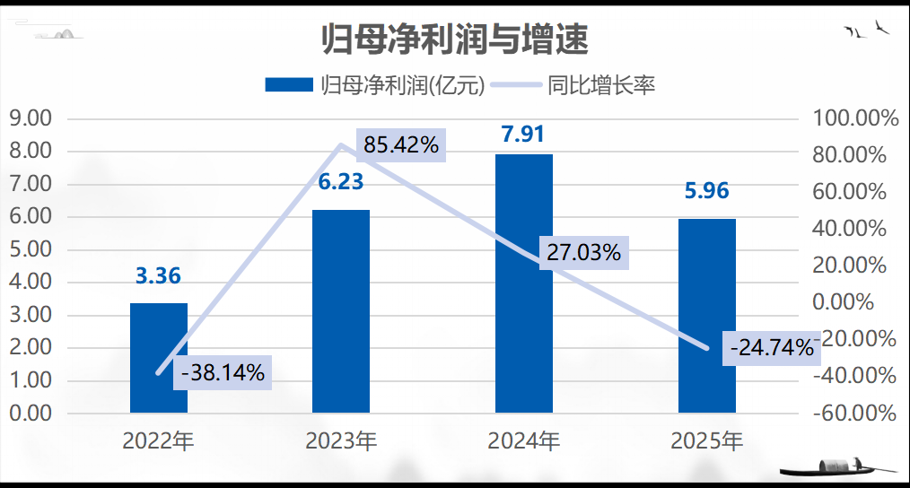 2022-2025年公司营收分别为22.67亿元、29.31亿元、31.2亿元和28.04亿元,CAGR为7.34%;2022-2025年公司归母净利润分别为3.36亿元、6.23亿元、7.91亿元和5.96亿元,CAGR为21.05%。