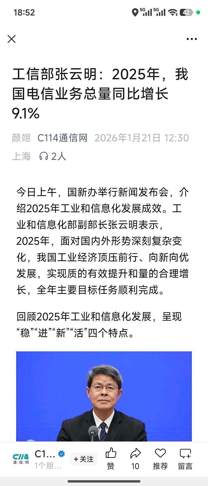 利好来了,电信业务总量增长百分之九以上,大超预期。