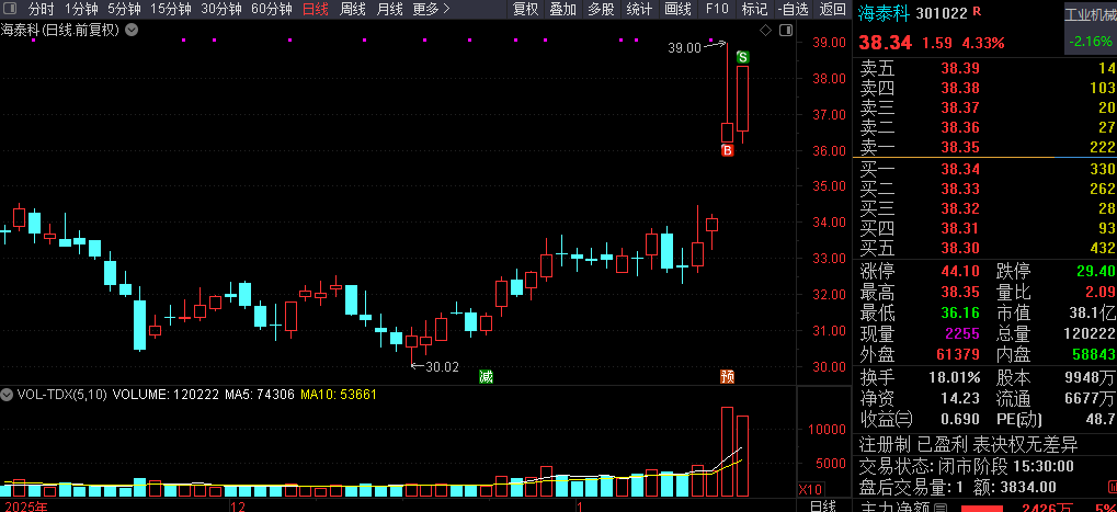 海泰科开盘大幅拉升追进去的,但主力就再也没有拉升动作了,高开的上影线就落了下来。但一般这种红上影线次日都有回冲的概率,所以,次日我就一直等,好在下午开盘主力终于有了大拉升,在这次拉升的最高点卖出了!该股能盈利出来,都是凭自己在市场短线搏杀的丰富经验!
