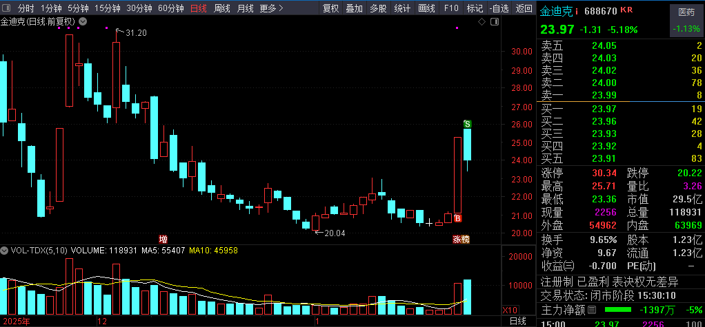 帕尼病毒消息让生物疫苗股强势,批量涨停,看着其他生物股涨停,就捉了个容易捉的金迪克,金迪克也不负厚望,下午也20CM涨停!但次日的小幅高开预示着动能衰退,集合竞价时就赶紧溜了!好久都没有捉到20CM了!