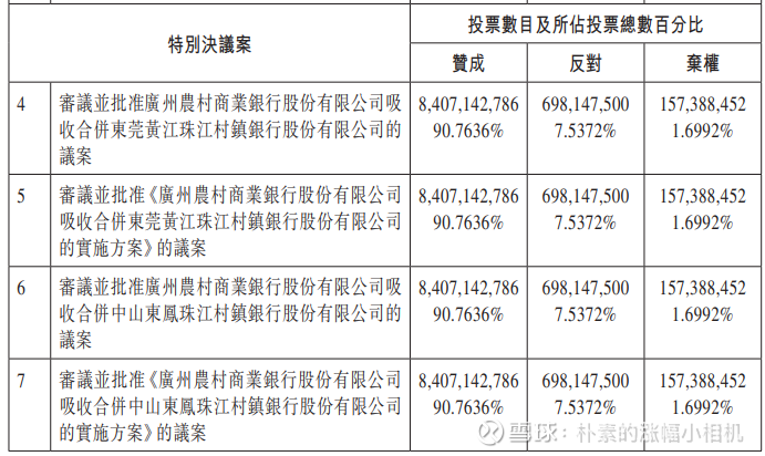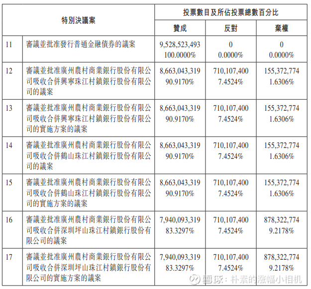 另外,第16、17项关于深圳坪山珠江村镇银行的议案,弃权票占比高达9.2178%,赞成票占比则为83.3297%。