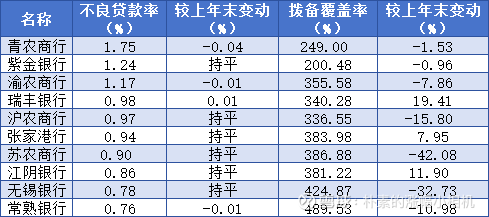 不良贷款率在1%以上的还有紫金银行、渝农商行,分别为1.24%、1.17%。常熟银行不良贷款率最低,为0.76%。
