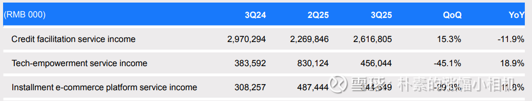 拆解乐信营收结构看,主要由三部分构成,分别是信贷撮合服务收入、技术赋能服务收入、分期电商平台服务收入。其中,该公司主力营收为信贷撮合服务收入,三季度为26.17亿元,较去年同期下降11.9%。而从技术赋能服务收入、分期电商平台服务收入看,同比均实现了正增长,但环比均为负增长。