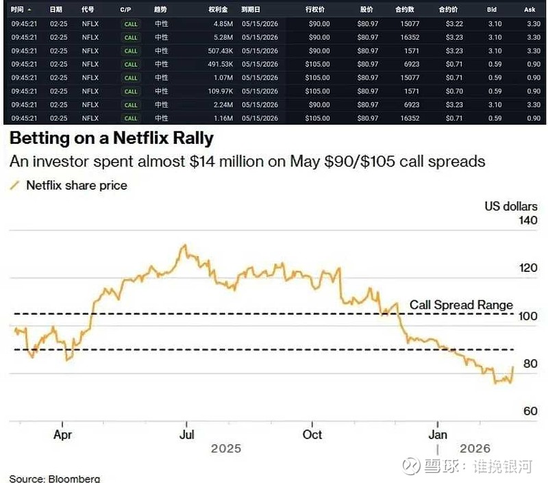 该策略风险与收益高度清晰:最大亏损为全部权利金1380万美元,到期日奈飞股价高于92.51美元即可实现盈利;若股价涨至105美元,可斩获约6800万美元理论最大收益,回报率接近5倍。与单纯买入看涨期权相比,此举以封顶涨幅为代价,大幅降低入场成本,更适合捕捉事件驱动下的确定性温和上涨。