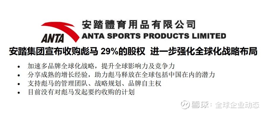 安踏体育用品有限公司(Anta Sports)1月27日宣布,与Pinault家族旗下投资公司Groupe Artemis达成购股协议,以15亿欧元现金收购彪马(Puma)所属公司PUMA SE 29.06%的股权,交易完成后安踏集团将成为彪马最大股东,该笔收购资金全部来源于集团内部自有现金储备。本次交易预计2026年底前完成,仍需获得相关监管部门批准并满足惯例交割条件。通过此次收购,安踏集团会成为彪马公司的最大股东,“安踏集团+亚玛芬+彪马”的全球营收将直逼阿迪达斯。